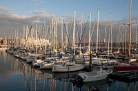 Deze foto vangt een perfect moment: De haven van Lissabon, vlak voor zonsondergang. De masten van de zeilboten strekken zich uit naar de hemel als fijne lijnen, weerspiegeld in het kalme water van de Taag - bijna alsof iemand ze heeft getekend met een penseel en liniaal. Het landschap straalt een rustgevende kalmte uit die maritiem…