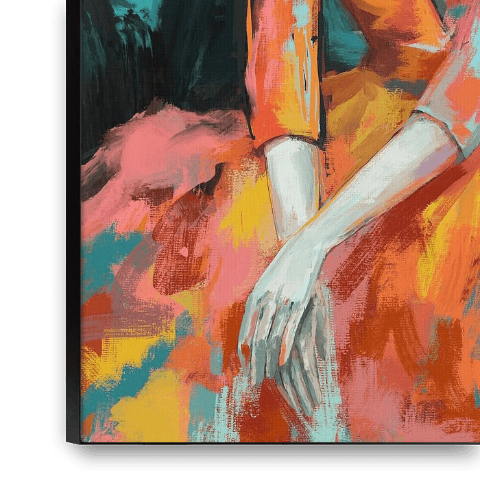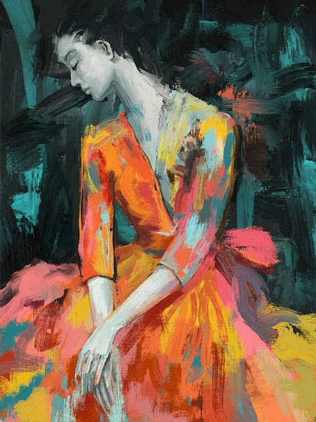 Een expressief portret van een contemplatieve vrouw in een levendige oranje en karmozijnrode jurk, tegen een diepe blauwgroene abstracte achtergrond. Gedurfde penseelstreken en contrasterende kleuren creëren een opvallende balans tussen warmte en introspectieve rust.