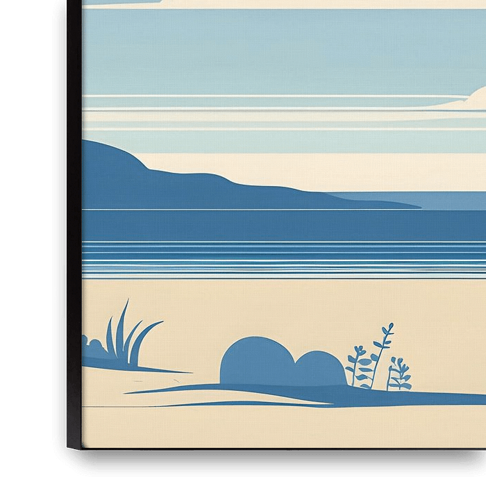 Een serene illustratie van een kustlandschap met een vredig uitzicht op het strand tijdens het gouden uur. De compositie bestaat uit zachtblauwe luchten met opbollende crèmekleurige wolken, verre eilanden aan de horizon en kalm water in verschillende tinten blauw. Een warm zandstrand op de voorgrond wordt omlijst door silhouetten van…