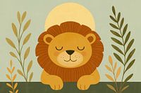 Een vriendelijke leeuw met gesloten ogen rust onder een grote ronde zon, omringd door slanke bladeren en zachte vormen. De volle manen tekenen zich grafisch af, terwijl organische takken en een rustige achtergrond zorgen voor balans. Heldere vormen en subtiele contrasten geven het beeld een warme, moderne uitstraling die perfect past in…