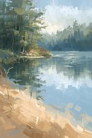 Een rustige, schilderachtige scène aan de oever van het meer, waarin zacht ochtendlicht over het water glijdt. De zachte penseelstreken en reflecterende kleurtonen creëren een sfeer van rust, nabijheid tot de natuur en stille harmonie.