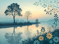 Terwijl de ochtendschemering de lucht kleurt, ontvouwt zich een sereen landschap langs een rustige rivieroever. Silhouet bomen staan sierlijk tegen de mistige horizon, hun skeletachtige takken perfect weerspiegeld in het stille water eronder. Delicate wilde bloemen in crèmekleurige en gouden tinten staan op de voorgrond en voegen een…