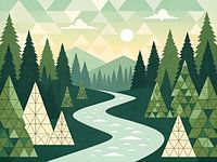 Een gestileerde digitale illustratie van een sereen landschap. Een kronkelende, lichtblauwe rivier stroomt door een dicht bos van altijd groene bomen in verschillende tinten groen. De bomen op de voorgrond hebben ingewikkelde geometrische patronen in hun driehoekige vormen, wat een modern en artistiek tintje toevoegt. Bergen in de verte vervagen in een zachte, lichtgele en groene lucht bezaaid met pluizige witte wolken en een zachte, witte zon. De algehele esthetiek is vredig en grafisch, met de nadruk op vorm en kleur.