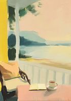 Dit impressionistische schilderij toont een vredig tafereel op een veranda. Op de voorgrond staat een lichtroze tafel met een open boek, daarnaast een wit theekopje op een schoteltje met donkere thee. Daarachter staat een rieten stoel met een lichtgeel kussen. Op de achtergrond is een zacht glinsterend meer in pasteltinten blauw en…