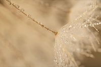 "Rustige zachte pastelkleuren: Close-up van druppels aan een pluisje van een paardenbloem" is een macrofoto van een klein pluisje aan een paardenbloem. Op de achtergrond zie je nog vaag de lijnen van de andere pluisjes aan de pluizenbol van de paardenbloem.