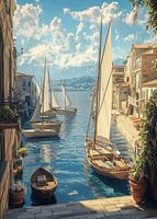 Dit maritieme kunstwerk toont een rustig haventafereel met verschillende traditionele zeilboten afgemeerd langs een idyllisch kanaal tussen oude gebouwen. Het heldere water weerspiegelt de witte tuigage en de blauwe lucht, terwijl het uitzicht in de verte voert over een zacht glooiend landschap. De mediterrane charme, het warme zonlicht en de liefdevol gearrangeerde details maken dit decor tot een sfeervolle blikvanger voor elke kamer.