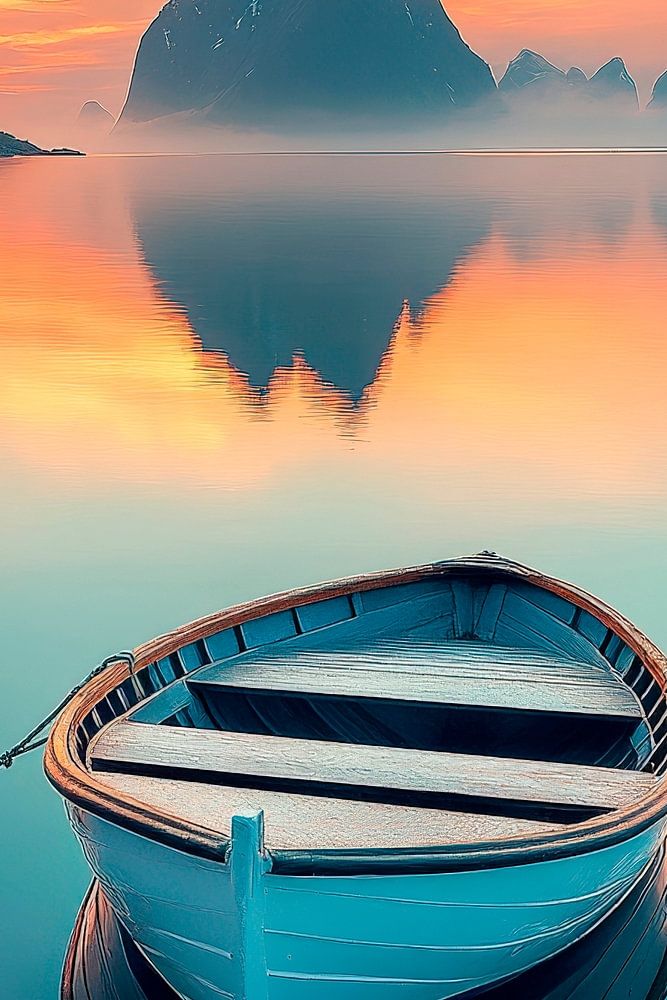 Een zachte zonsopgang wordt weerspiegeld in het gladde water, terwijl een eenzame boot in stille harmonie dobbert. De rustgevende kleuren blauw en oranje creëren een sfeer van kalmte en reflectie. Perfect voor de slaapkamer, het nodigt je uit om de dag rustig te beginnen of je gedachten te laten afdwalen in de avond.