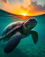 Een vredige schildpad zwemt rustig door het heldere, zacht glinsterende water van de oceaan terwijl de zon ondergaat in een spectaculair kleurenspel aan de horizon. De oranje en roze stralen baden de omgeving in een warm licht dat het gladde schild van de schildpad in een fonkelend juweel verandert. Zijn kalme bewegingen zijn een harmonieuze choreografie van de natuur terwijl hij moeiteloos door de zachte golven glijdt.