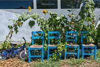 In Griekenland kom je ze veel tegen, plekken waar stoelen staan om lekker uit te rusten, iets te drinken of gewoon gezellig met elkaar zijn.