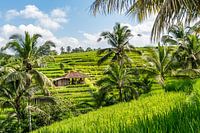 Het landschap ontvouwt zich als een levend kunstwerk tegen de helling van de berg. De rijstvelden zijn met uiterste precisie aangelegd in terrasvorm, waardoor ze lijken op gigantische, groene treden die sierlijk naar beneden golven. Elke trede is een bewijs van menselijke vindingrijkheid, harmonieus ingepast in de natuurlijke contouren…