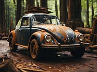 Een oldtimer Volkswagen Kever in een urbex omgeving getekend door roestvlekken en patina.