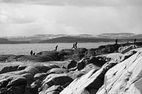 De foto toont een serene zwart-wit compositie van een ruige kustlijn, waar meerdere mensen zich op de rotsen bevinden. Sommigen staan, terwijl anderen wandelen of lijken te observeren. De voorgrond bestaat uit de ruige structuur van de rotsen, die een levendige textuur toevoegen. In de achtergrond strekt zee zich uit, omgeven door…