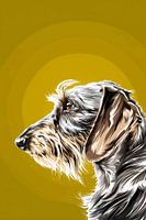 Tegen de gele achtergrond krijgt deze ruwharige teckel een heel andere uitstraling. Geel brengt energie, licht en speelsheid in het werk en laat de hond bijna stralen. De scherpe illustratieve lijnen en contrastrijke kleuren geven het portret een moderne, frisse uitstraling. De teckel oogt nieuwsgierig en levendig, alsof hij elk moment…