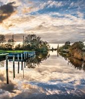 Het haventje van Ryptsjerk, Rijperkerk- Friesland, met de molen op de achtergrond en het gekleurde wolkendek bij de ondergaande zon weerspiegelend in het stilstaande water
