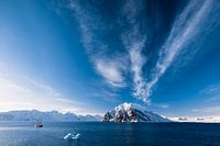 Een weids beeld met het donkerblauwe water, de wit besneeuwde fjorden op de achtergrond en de helder blauwe lucht. Wat is het zeilschip dan verhoudingsgewijs klein.