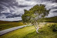Een solidaire boom met een s stam met een weg zo als vaak in Schotland; niet recht maar het landschap als architect van de route.