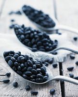 eten, koken, keuken, bonen, zwarte bonen, drie, zwart, stilleven, lepel, lepels, peul, peulvruchten, vintage, retro, grijs, vegetarisch, vegetariër, vegetarier , gezond, gezond eten