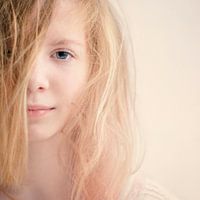 Meisje, tiener, 12-14 jaar, 13-15 jaar, lang haar, blond, mysterieus, dromerig, vooraanzicht, portret, los haar, kijkt in de camera, verlegen, roze, blauwe ogen, puur, naturel, verwaaid