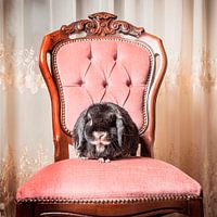 Grijs konijn, rose stoel, fluweel, gestoffeerde stoel, antiek, huisdier, retro, vintage, aaibaar