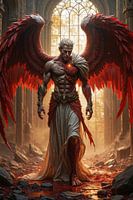 Uit de hallen van verbrijzelde kathedralen treedt SARAPHON naar voren, de engel van het lijden. Zijn enorme karmozijnrode vleugels spreiden zich uit boven een pad van bloed en steen, zijn blik neergeslagen in plechtige stilte, alsof hij de pijn van de hele mensheid op zijn schouders draagt.