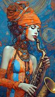 Kleurrijk portret van een vrouw in Boho stijl met een saxofoon.