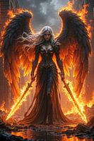 Tussen rook en vuur rijst zij op – een gevleugelde krijgeres van licht en toorn. Haar zwarte vleugels staan in vlammen van goud, haar ogen gloeien als het oordeel zelf. In haar handen houdt zij twee vurige zwaarden, gesmeed uit goddelijke woede. De ruïnes beven wanneer zij door de storm van de Apocalyps stapt. Elke stap laat een spoor van licht en as achter.