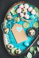 Gekleurde kwarteleitjes, gedroogde bloemen en bladeren voor paasvakantie, turquoise, blauw, groen, roze, pasen, paas, kleurrijk, feestdag, food art, donkere achtergrond, genieten, heerlijk