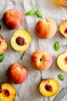Verse perziken op een linnen tafelkleed, fruit, suiker, gezond, grijzige achtergrond, gekleurd fruit, lekker, smaakvol, genieten, voedselcollectie, vers fruit, lekker eten, food art