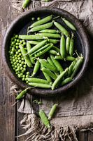 groen, grijs, antracite, vintage doek, stilleven, erwtjes, peultjes, erwt, peul, peulen, bonen, boontjes, vegetarisch, koken, keuken, rustiek, gezond eten, groente, groenten, bijgerecht, schaaltje, terracotta, authentiek