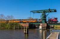 SHM 16 passeert met de stoomtram de Overlekersluis-spoorbrug te Medemblik