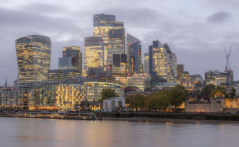 De skyline van London tijdens zonsondergang.