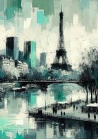 Romantische skyline van Parijs, geschilderd in abstracte en pastelkleuren. Langs de Seine en natuurlijk met de Eiffeltoren. Moderne gemengde techniek, digitaal gemaakt. ©12/2024 door Pia Schneider, atelier COLOUR-VISION