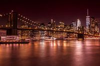 Betoverende nachtelijke Skyline van het zuidelijke deel van Manhattan met Brooklyn Bridge op de voorgrond. De lichten van de stad die in de East River. Een klassieke stedelijke bekijken van New York City.