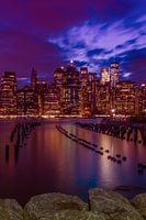 Betoverende avond Skyline van het zuidelijke deel van Manhattan. De lichten van de stad die in de East River. Een klassieke stedelijke bekijken van New York City met golfbrekers op de voorgrond.