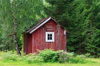 Foto van een oude boshut in het Krokshult natuurreservaat in Småland, Zweden.