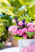 Stillleben mit Sommerblüten in rosa und violett vor frischem grünen sonnigen Hintergrund