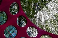Het kunstwerk "SONY Center Berlin - Roof" toont een ongebruikelijk perspectief op de iconische dakconstructie van het Sony Centre aan de Potsdamer Platz. Het uitzicht is naar boven gericht, door een rode, geperforeerde sculptuur met cirkelvormige openingen. Deze omlijsten de architectonische elementen van het dak - radiaal gespannen…