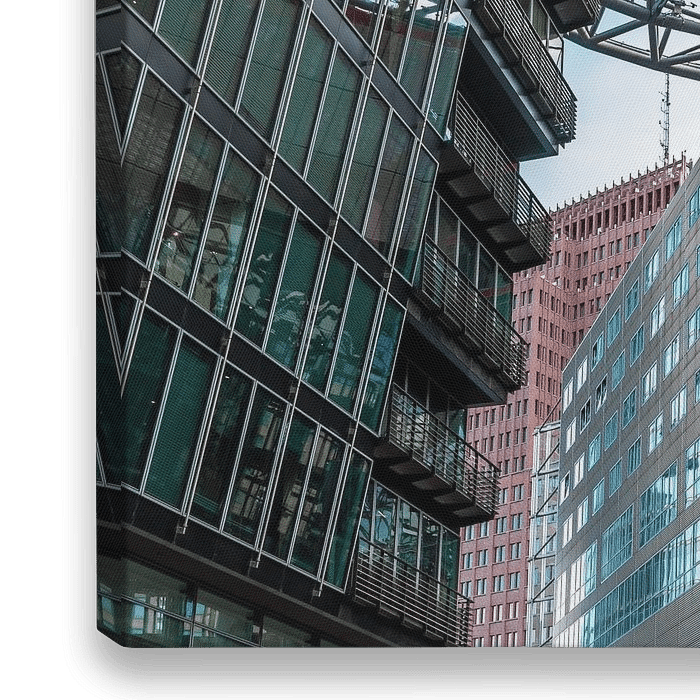 Het kunstwerk "SONY Center Berlin" toont de architectonische diversiteit en ruimtelijke dynamiek van het gelijknamige gebouwenensemble aan de Potsdamer Platz. Op de voorgrond staat een modern gebouw met een heldere glazen gevel, talloze ramen en balkons. Daarachter ontvouwt zich de iconische dakconstructie van het Sony Centre - een…