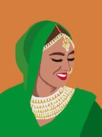 Moderne, digitale illustratie van een Indiase vrouw. De kleuren die in dit werk zijn gebruikt komen uit de kleurenlijn van Marie-gon, ontworpen voor het merk Vestingh. De kleuren zijn geïnspireerd op Indiase kruiden.