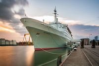 De zon gaat onder achter de SS Rotterdam in katendrecht.