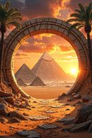 Een oeroude stenen poort opent het uitzicht op de machtige piramiden, verlicht door het brandende licht van de ondergaande zon. De woestijn gloeit als een zee van vuur, palmen omlijsten de ingang en de hemel zelf lijkt te branden. Dit is geen gewoon tafereel – het is de Poort der Goden, de sleutel tot een macht die niet van deze wereld is.