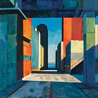 Stap in een wereld waar architectuur en abstractie samenkomen. Dit opvallende kunstwerk vangt de essentie van stedelijke landschappen door middel van gedurfde geometrische vormen en een meesterlijk samenspel van kleur en schaduw. Levendige blokken turquoise,…