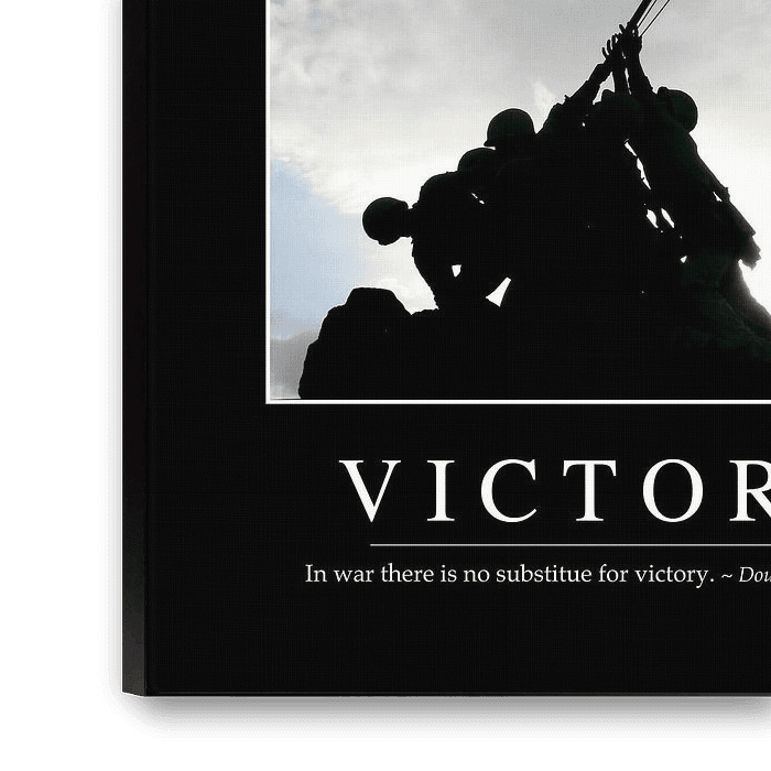 Overwinning - Inspirerende Citaat en Motiverende Poster. De tekst luidt: In oorlog is er geen vervanging voor overwinning. ~ Douglas MacArthur