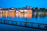 De skyline van de wijk Södermalm op het blauwe uur, Stockholm, Zweden