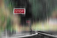 STOP - een eindigend spoor bij een bijna gesloten station vastgelegd in een dubbele belichting in het avondlicht. Ik heb Stop digitaal toegevoegd omdat ik zo vaak STOP wil zeggen.