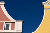 Foto van oude huisgevels in Stralsund, Duitsland. Een minimalistische opname van de kleurrijke huismuren.