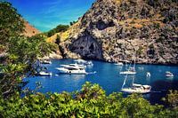 De inham in de rots lijkt op de kop van een reusachtig stenen wezen. Het helderblauwe water vormt een mooi contrast met de vele witte bootjes.