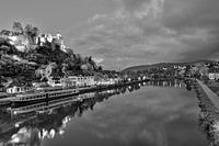 Nachtgezicht van Saarburg aan de Saar in zwart-wit