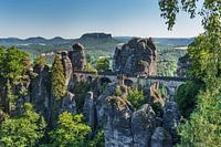Aussicht vom Ferdinandstein zur Felsformation Bastei und Basteibrücke. Es ist eine der meistbesuchten Touristenattraktionen der Sächsischen Schweiz. Dahinter befindet sich der Tafelberg Lilienstein. Er ist einer der markantesten Berge im Elbsandsteingebirge, Gemeinde Lohmen, Sachsen, Deutschland, Europa