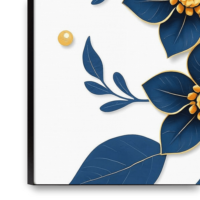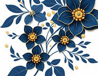 Dit ontwerp heeft een cluster gestileerde bloemen in een rijke blauwe tint met opvallende gouden contouren en middelpunten. De bloemen hebben een ronde, bijna klokvormige vorm met gelaagde bloemblaadjes, waardoor ze er dimensionaal uitzien. Ze worden afgewisseld met kleinere, ronde gouden accenten die lijken op bessen of knoppen, wat…